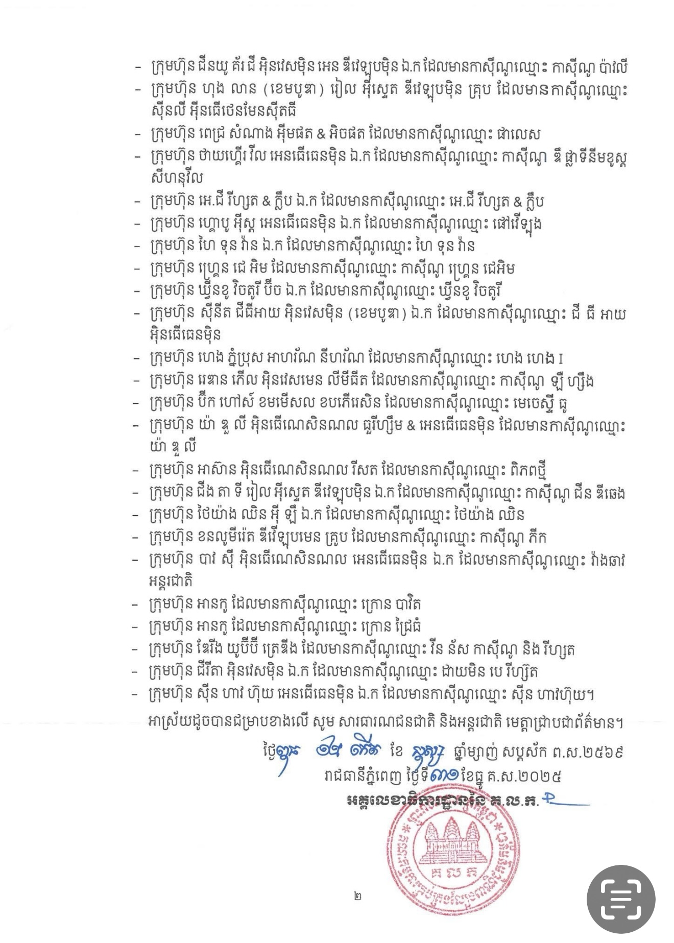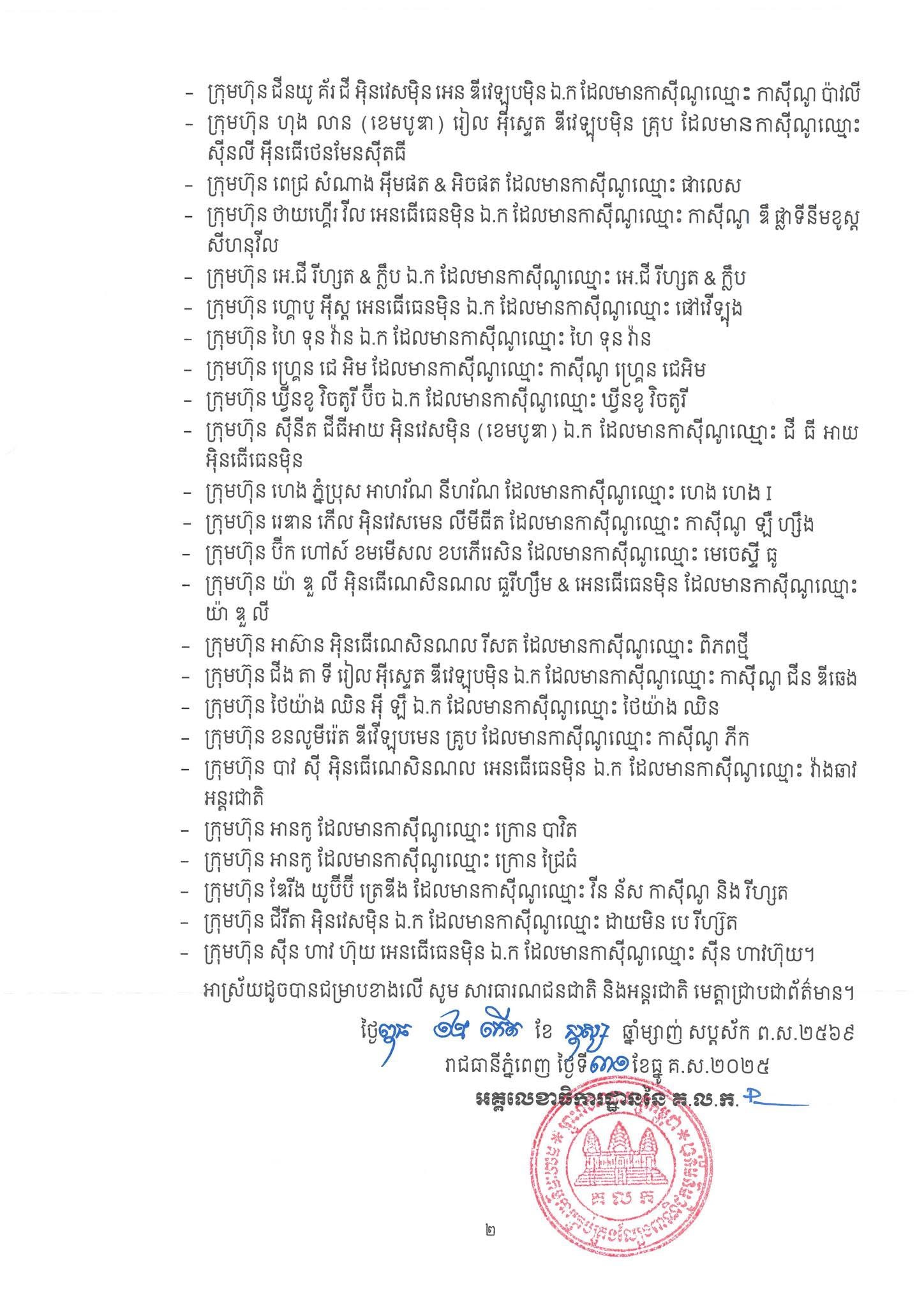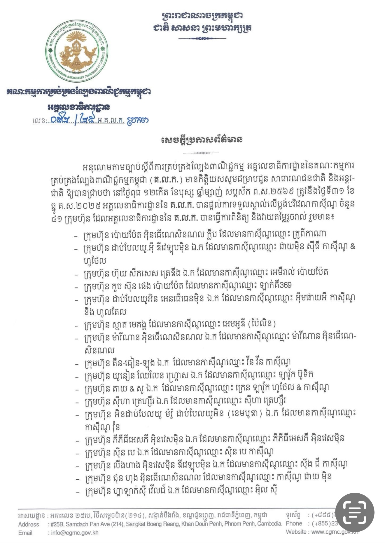 ភ្នំពេញ៖ សេចក្តីប្រកាសព័ត៌មាន អនុលោមតាមច្បាប់ស្តីពីការគ្រប់គ្រងល្បែងពាណិជ្ជកម្ម អគ្គលេខាធិការដ្ឋាននៃគណៈកម្មការ គ្រប់គ្រងល្បែងពាណិជ្ជកម្មកម្ពុជា (គ.ល.ក.) មានកិត្តិយសសូមជម្រាបជូន សាធារណជនជាតិ និងអន្តរ ជាតិ ឱ្យបានជ្រាបថា នៅថ្ងៃពុធ ១២កើត ខែបុស្ស ឆ្នាំម្សាញ់ សប្តស័ក ព.ស.២៥៦៩ ត្រូវនឹងថ្ងៃទី៣១ ខែ ធ្នូ គ.ស.២០២៥ អគ្គលេខាធិការដ្ឋាននៃ គ.ល.ក. បានផ្តល់ការទទួលស្គាល់លើប្លង់បរិវេណកាស៊ីណូ ចំនួន ៤១ ក្រុមហ៊ុន ដែលអគ្គលេខាធិការដ្ឋាននៃ គ.ល.ក. បានធ្វើការពិនិត្យ និងវាយតម្លៃរួចរាល់ហើយ។ អគ្គលេខាធិការដ្ឋាននៃគណៈកម្មការគ្រប់គ្រងល្បែងពាណិជ្ជកម្មកម្ពុជា (គ.ល.ក.) សូមជូនសេចក្តីប្រកាសព័ត៌មានលេខ ០៥២/២៥ អ.គ.ល.ក.ប្រកព ចុះថ្ងៃទី៣១ ខែធ្នូ គ.ស.២០២៥។