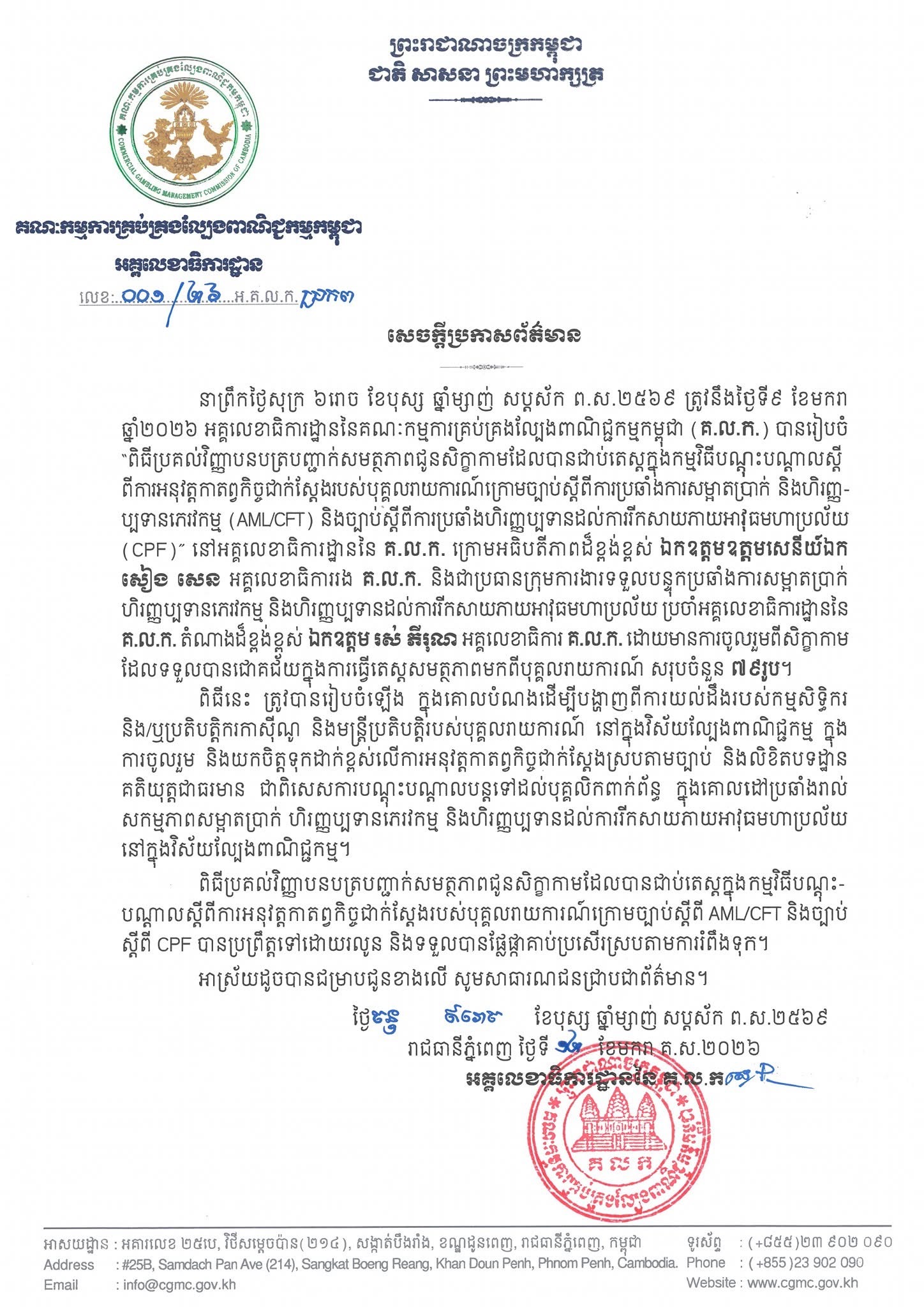 អគ្គលេខាធិការដ្ឋាននៃគណៈកម្មការគ្រប់គ្រងល្បែងពាណិជ្ជកម្មកម្ពុជា (គ.ល.ក.) សូមជូនសេចក្តីប្រកាសព័ត៌មានលេខ ០០២/២៦ អ.គ.ល.ក.ប្រកព ចុះថ្ងៃទី១២ ខែមករា គ.ស.២០២៦។ (vojhotnews)