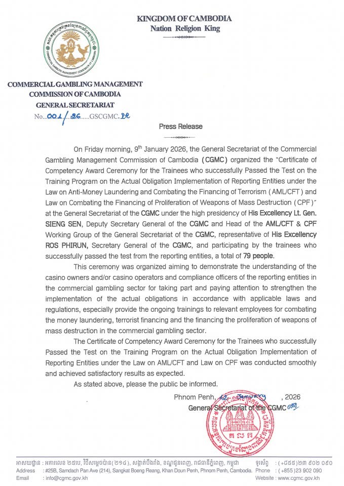 (ភ្នំពេញ) ក្រោមអធិបតីភាពដ៏ខ្ពង់ខ្ពស់ ឯកឧត្តមឧត្តមសេនីយ៍ឯក សៀង សេន អគ្គលេខាធិការរង នៃអគ្គលេខាធិការដ្ឋាន គណ:កម្មការគ្រប់គ្រងល្បែងពាណិជ្ជកម្មកម្ពុជា (គ.ល.ក.) និងជាប្រធានក្រុមការងារទទួលបន្ទុកប្រឆាំងការសម្អាតប្រាក់ ហិរញ្ញប្បទានភេរវកម្ម និងហិរញ្ញប្បទានដល់ការរីកសាយភាយអាវុធមហាប្រល័យ ប្រចាំអគ្គលេខាធិការដ្ឋាននៃ គ.ល.ក. និងតំណាងដ៏ខ្ពង់ខ្ពស់ ឯកឧត្តម រស់ ភីរុណ អគ្គលេខាធិការ នៃអគ្គលេខាធិការដ្ឋាន គណ:កម្មការគ្រប់គ្រងល្បែងពាណិជ្ជកម្មកម្ពុជា (គ.ល.ក.) នាព្រឹកថ្ងៃសុក្រ ៦រោច ខែបុស្ស ឆ្នាំម្សាញ់ សប្តស័ក ព.ស.២៥៦៩ ត្រូវនឹងថ្ងៃទី៩ ខែមករា ឆ្នាំ២០២៦ បានរៀបចំ “ពិធីប្រគល់វិញ្ញាបនបត្របញ្ជាក់សមត្ថភាពជូនសិក្ខាសរុបចំនួន ៧៩រូបកាមដែលបានជាប់តេស្តក្នុងកម្មវិធីបណ្តុះបណ្តាលស្តី ពីការអនុវត្តកាតព្វកិច្ចជាក់ស្តែងរបស់បុគ្គលរាយការណ៍ក្រោមច្បាប់ស្តីពីការប្រឆាំងការសម្អាតប្រាក់ និងហិរញ្ញ ប្បទានភេរវកម្ម (AML/CFT) និងច្បាប់ស្តីពីការប្រឆាំងហិរញ្ញប្បទានដល់ការរីកសាយភាយអាវុធមហាប្រល័យ (CPF)”ដោយមានការចូលរួមពីសិក្ខាកាម ដែលទទួលបានជោគជ័យក្នុងការធ្វើតេស្តសមត្ថភាពមកពីបុគ្គលរាយការណ៍ របស់បណ្តាកាសុីណូសរុបចំនួន ៧៩រូប នៅអគ្គលេខាធិការដ្ឋាននៃ គ.ល.ក. ។ ឯកឧត្តមឧត្តមសេនីយ៍ឯក សៀង សេន អគ្គលេខាធិការរង (គ.ល.ក. )និងជាប្រធានក្រុមការងារទទួលបន្ទុកប្រឆាំងការសម្អាតប្រាក់ ហិរញ្ញប្បទានភេរវកម្ម និងហិរញ្ញប្បទានដល់ការរីកសាយភាយអាវុធមហាប្រល័យ ប្រចាំអគ្គលេខាធិការដ្ឋាននៃ គ.ល.ក. បានមានប្រសាសន៏បញ្ជាក់ថា វគ្គបណ្តុះបណ្តាលត្រូវបានរៀបចំទ្បើងនេះក្នុងគោលបំណងដើម្បីបង្ហាញពីការយល់ដឹងរបស់ កម្មសិទ្ធិករ និងប្រតិបត្តិករកាសុីណូ និងមន្រ្តីប្រតិបត្តិរបស់បុគ្គលរាយការណ៍ក្នុងវិសយ័ល្បែងពាណិជ្ជកម្មក្នុងការអនុវត្តច្បាប់ និងលិខិតបទដ្ឋានគតិយុត្តជាធរមាន។ការចូលរួមពីសិក្ខាកាម ទទួលបានជោគជ័យក្នុងការធ្វើតេស្តសមត្ថភាពមកពីបុគ្គលរាយការណ៍ របស់មន្រ្តីរាយការណ៍របស់បណ្តាកាសុីណូសរុបចំនួន ៧៩រូបត្រូវទទួលបានវិញ្ញាបនបត្របញ្ជាក់មានសមត្ថភាព៕